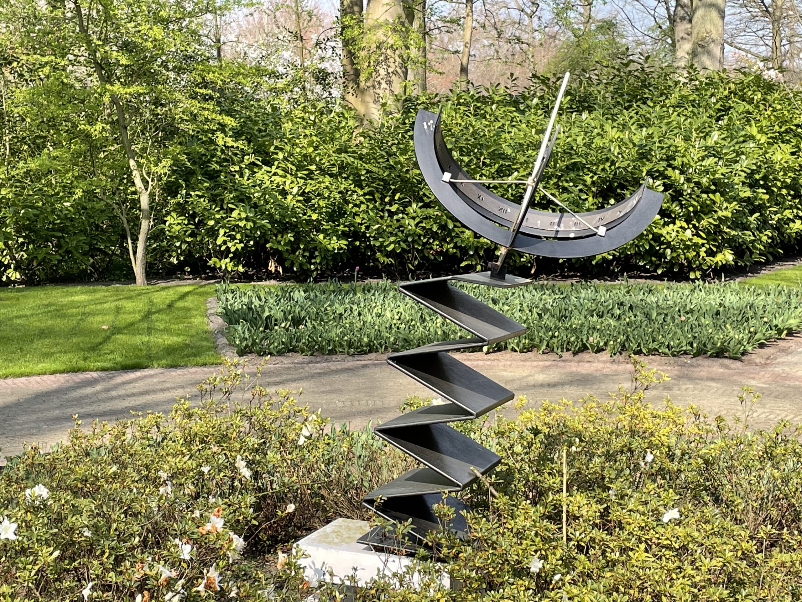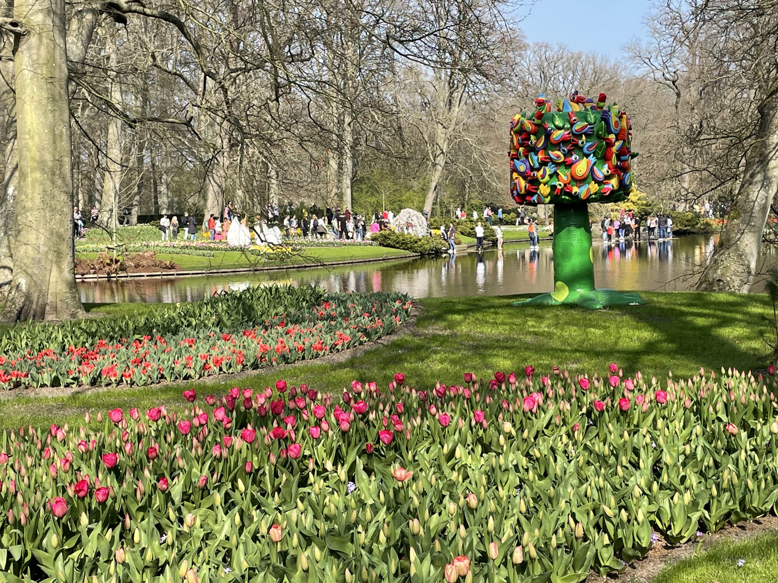 Der Park beherbergt nebst der vielen Blumen auch 19 verschiedene permanente Kunstobjekte. Hinzu kommen an die 40 ständig wechselnde Objekte, die es wert sind, bestaunt zu werden. Die weißen Klumpen inmitten der roten Tulpenfelder sind immer ein prachtvoller Anblick. Selbst wenn man keine Blumen mag, lohnt sich der Spaziergang auch deswegen. Ob das verrostete Auto aus dem Beitragsbild wieder da ist?